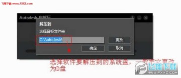 建议安装在D盘 点击“更改”可以选择目录盘 当然也可以就安装在C盘,我们这里就解压到C:\Autodesk\ 如图二。