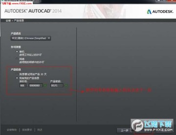 在产品信息的输入界面,我们在产品语言这一栏中选择“中文(简体)”,许可类型这里我们选择单机,产品信息这里就很重要了,要输入序列号和产品密钥。这个我们从注册机中来获取,详细看下一步操作。 如图五。