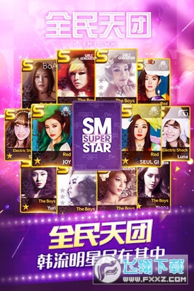《全民天团》是一款由SM娱乐公司正版授权的音乐类休闲手机音乐游戏!在这里你会与EXO、少女时代、Super junior、东方神起、等16组明星天团零距离亲密接触!通过明星卡片的收集,16个天团组合高清卡牌满足你的收集欲望,各种神秘造型等待你的挖掘!