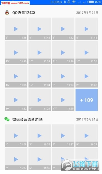 2.点击“+”号就可以继续寻找当天的语音消息了,我们可以看到,当天的所有语音消息都以时间倒序的方式罗列了出来。可以根据语音消息的时长,再回到QQ或者微信的聊天界面查看,精准的定位到自己想要的语音消息。点击图表上的播放键,可以试听每一段音频;再次点击则会终止语音的播放。