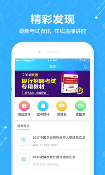5.发现精彩:发现栏目和试卷栏目,会推荐考试课程与最新书籍,学员可以一键购买!