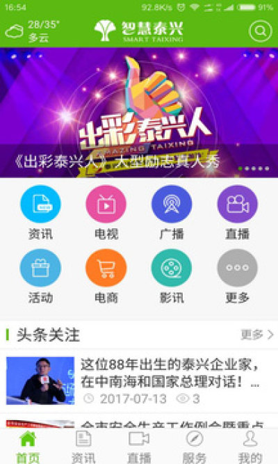 智慧泰兴——公共信息集成应用平台,泰兴市广播电视台、泰兴文化广电传媒有限公司荣誉出品,集新闻资讯整合、公共信息发布、智慧生活服务、商业消费应用、娱乐共享互动五大功能于一体,融即时性、便捷性、灵活性于一身,提供本地媒体应用、各类生活应用和区域门户应用,倾力打造面向未来的文化服务平台、民生应用平台、新媒体发布平台和电子商务平台。