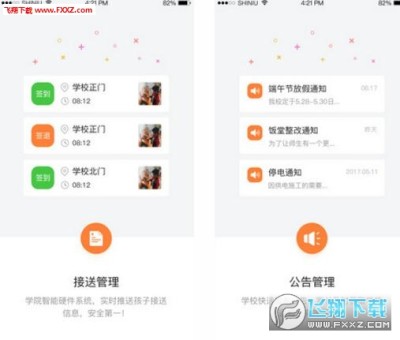 家长、学生进出校门,刷卡拍照,其他亲属和老师可实时接收到学生接送/考勤情况;老师可实时查询学生考勤情况,实现学生出勤智能化管理。