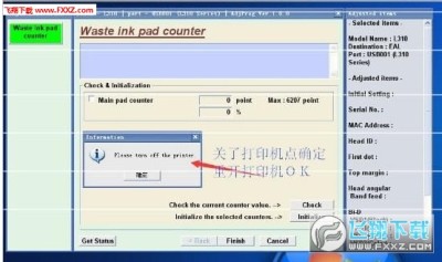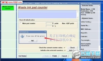 6.蓝色进度条跑完提示[plese turn off the printer] 请关闭打印机,然后点击[确定],接着点[确定]重开打印机。如下图。