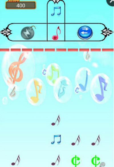 音符大爆炸是一款消除类手游,当手指点击某一列时,上方第一列的音符会下落到这一列,且三个或以上的相同颜色音符碰撞时会消除。手指所指按钮可以调整音符位置,每下落五个音符左边炸弹会被点亮,点击炸弹可以把上方音符变为炸弹。