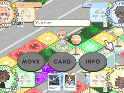 游戏画面采用日系画风,不论是颜色还是整体看来都很可爱。游戏玩法同大富翁类似,需要通过掷骰子来移动和战斗,操作起来相当简便,并不需要过多人工操作。