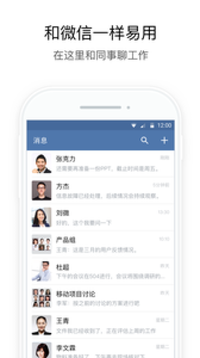 免费网络通话,图文、消息、位置、名片等发送,工作群组、电子通知,即时沟通提升办公协作效率。