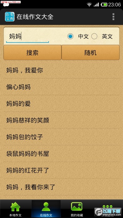 支持英文作文搜索!在线作文大全是一款面向各年级学生而开发的小型学习软件,内置离线作文20000篇,没有网络也能找查作文啦!另外只要输入一两个关键字就可以抓取网络上优秀的作文,包括英语作文哟。支持收藏好文章到本地手机上,有了在线作文大全,妈妈再也不用担心我的学习了。