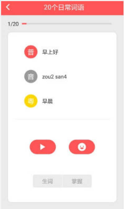 背单词什么很麻烦?每课均有闯关模式,分难度进行,想知道自己的粤语发音水平,快来看看自己闯了多少关吧。
