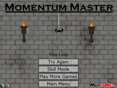 对着画面中钉在墙上圆形的支点,按住滑鼠左键,就可把蜘蛛丝射到支点上,若松开左键,蜘蛛丝就会消失,蜘蛛亦会坠下,就靠这样产生不同的物理反应来把蜘蛛送到画面的右边。
