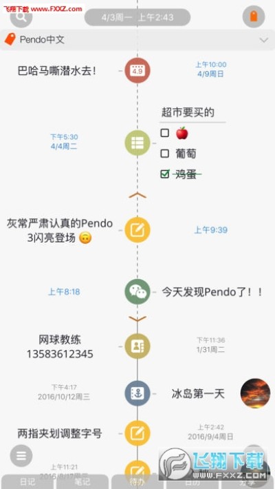 在初次开启Pendo软件时,用户可以在类似时间线的界面中了解软件的基本用法,比如如何调整字体、添加或是删除一条记录。当你加入记录时,会根据时间顺序把前后记录的事项穿插起来。当你做完一件事,右划将它删除即可。