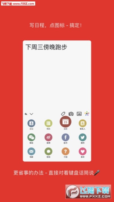• 智能日程:Pendo有IQ - 写(说)下复杂的日程计划,比如“每周三五晚8点游泳,持续四周”,点一下日程钮,喵就会帮你在对的时间安排好日程,显示到今日插件,并提前提醒你。