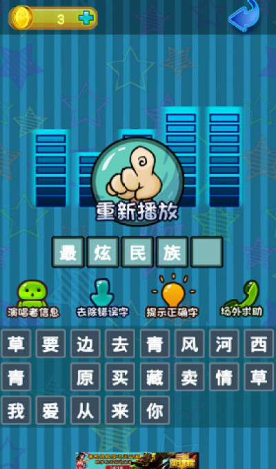 下面就是游戏中的第一部分答案,注意前面的是歌手,如果是合唱的歌曲,就会有好几个歌手名字哦,最后的一部分则是歌曲的名字。