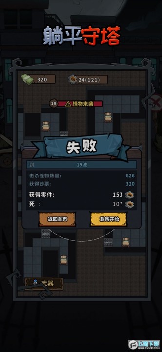 随着轮次增加,怪物的数量会增多,玩家需要消耗钞票或者零件对武器的攻击力、攻击速度等进行升级,抵御轮次越多,获得的钞票和零件奖励也越多。