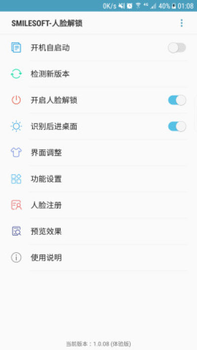 人脸解锁app中文版是一款人脸识别解锁软件,用于安卓手机,现在很流行人脸解锁手机,但是很多小伙伴都没有换手机,如果你也想体验人脸解锁,不妨来试试这款软件,可以让你体验人脸解锁,而且使用方法还很简单,喜欢的朋友赶紧来试试吧。