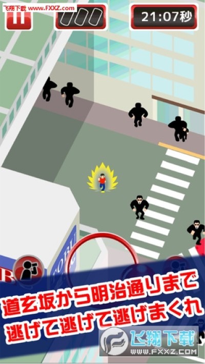 本作是一款简单易上手的休闲小品,玩家在游戏中扮演一个在涉谷逃亡的人,后面有一大堆警察在追捕,只要玩家在逃亡期间捡到道具就能在一定时间内无敌,被抓到则会直接GAME OVER。