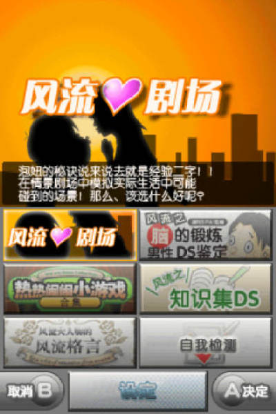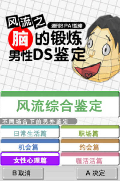 游戏的特色就是包含了日本SPA杂志社监修的“恋爱能力检测模式”以及“恋爱情景模拟模式”,玩家可以从这两个模式中检测自己的恋爱技巧。更厉害的是,游戏中收入了大量名人的“恋爱蜜语”,让你在约会时可以派上用场。