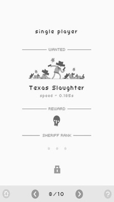 《牛仔大决斗2(Ready Steady Play)》是一款风格简洁的反应类游戏,与前作相同,游戏依然采用牛仔题材,但玩法上却丰富了不少。本作中,玩家不仅可以利用自己的反应速度在多个对手面前将其逐一消灭,同时保护女士,还可以骑上小马来一场跨栏比赛,甚至能够以精湛的枪术来射击空中的钱币,而使之不落地。