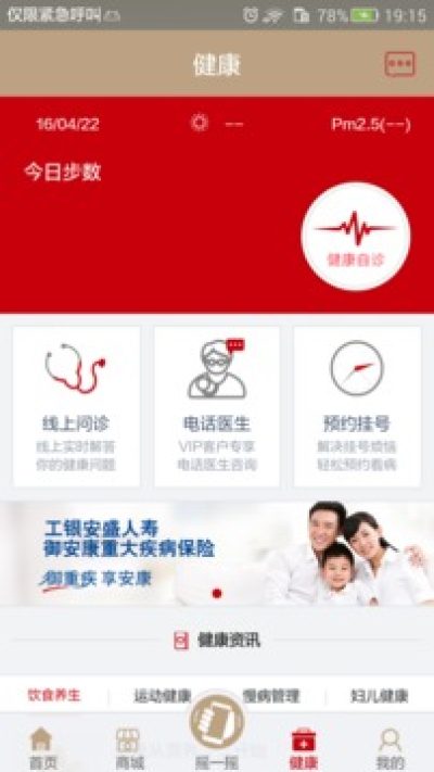 健康管理:为您提供健康资讯、线上问诊、电话医生、预约挂号、每日步数等服务,让您时时关注自身健康。