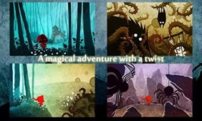 暗黑童话风格,融入故作粗糙的剪影。游戏深色调的背景与主角小红帽的红色斗篷形成鲜明的对比,黑色的乌鸦和蜘蛛穿插其间,配合游戏中低沉的背景音乐,显得诡异、复古而又刺激,使得游戏更加地吸引人。