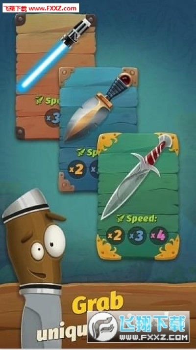 到达一定的分数时可以解锁出更多的飞刀,不止是飞刀,游戏中还有其他各种各样的刀,比如大砍刀,西瓜刀,屠龙刀什么的,用这么厉害的刀玩这么简单的游戏会不会太浪费了;