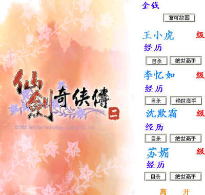 2.按下“富可敌国”你就会获得一座金山,从此衣食无忧;按下“绝世高手”后,被修改的人物属性底限值全变为99999,任何BOSS一招搞定;按下“自杀”则对应的人物体力为0;当然,你也可以手动修改金钱,经历,等级为你想要的数值(不推荐修改等级,会导致武术丢失)。