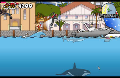 如果你的心情不是很好,那么就来这款游戏中发泄吧!你将扮演一条无恶不作的鲨鱼,尽情的破坏和撕咬,甚至可以将直升机、火箭,哪怕是UFO,都可以把它们咬住拖到水里。在游戏的终点,玩家们可以比一下分数的高低,看谁搞破坏的能力更强。