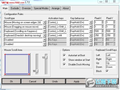 1、运行 Infinite Screen 后就是主界面设置,这里有鼠标与键盘两种操作方式,每种方式里又有不同的延伸方法,你可以设置不同的激活方式与移动的距离