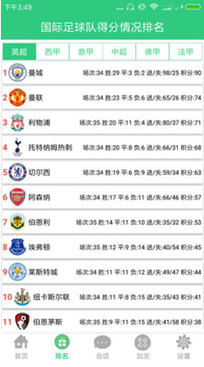 3) 排名栏目:提供国际足球队得分情况排名实时数据;