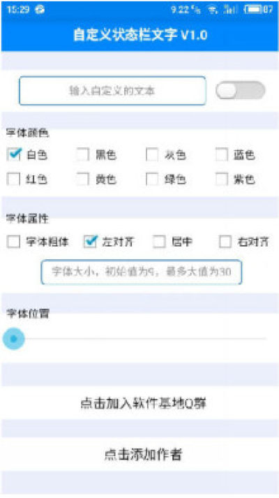 自定义手机顶部状态栏文字app 能够对手机顶部的文字进行自定义修改自己想要的文字,自定义状态栏文本目前只有小米手机自带的功能能修改,其他机型不能修改,所以特地开发了这个软件,而且可用自定义颜色参数、格式。