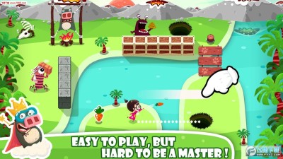 游戏玩家需要操作一个小女孩,通过风骚走位和扔萝卜来把怪物消灭,大部分的关卡就是用萝卜把怪物引到各种陷阱里,吃完所有萝卜便可以完美通关营救那只猪了!