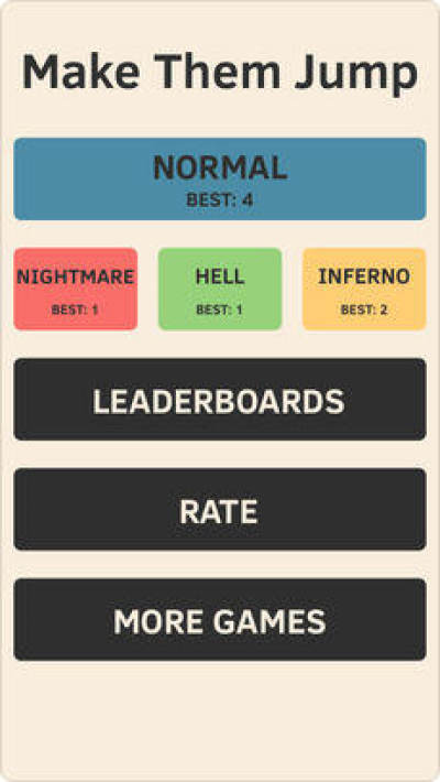 Make them Jumpios版是一款休闲娱乐类的手机游戏,该游戏由Ketchapp打造,其虐心程度简直到了一定的地步,不过游戏中有四种模式可以选择,玩家可以根据自己的能力水平来进行选择。。。