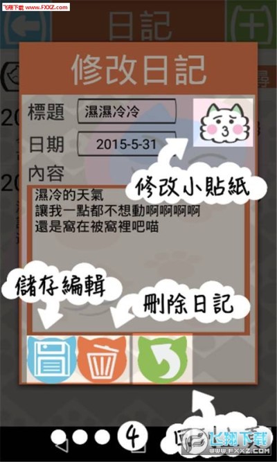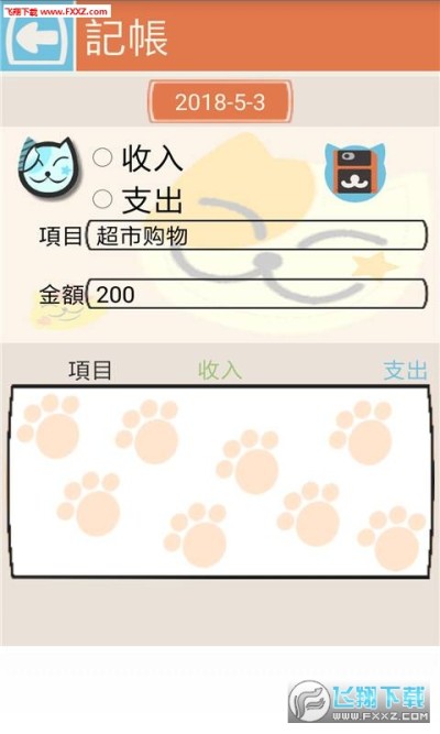 记帐:可选择喜爱的贴纸搭配,可选择日期进行记帐,新增记帐,帐目长按可进行修改删除