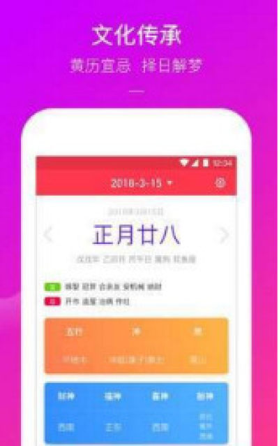 4、黄历:今日宜忌、五行风水、黄道吉日、吉神方位、冲、煞、值日天神、凶神、吉神宜趋、财神、胎神、喜神、福神、岁次、星期等黄历信息。