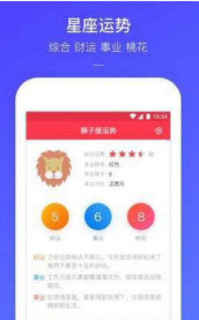 5、星座运势:打造专属个人运势日历,全面解析你的每日星座运势。综合运势、财运、事业运、桃花运等。