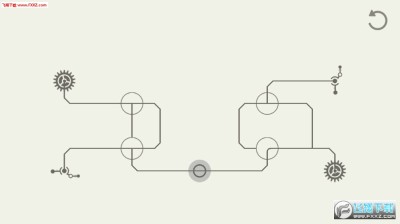 按下半透明圆圈,蓝色连线开始出发,途径各种关卡后,需要优先抵达那个被两个带着小尾巴的括号包裹的原点,注意不能先抵达那两个齿轮,否则失败。