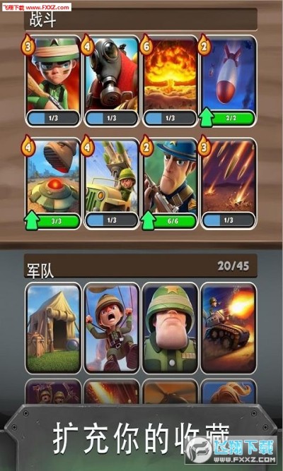 有超25种部队、武器卡牌供你发现、收集、升级。从毁灭性的歼击机,到炸飞敌人的危险地雷,应有尽有!