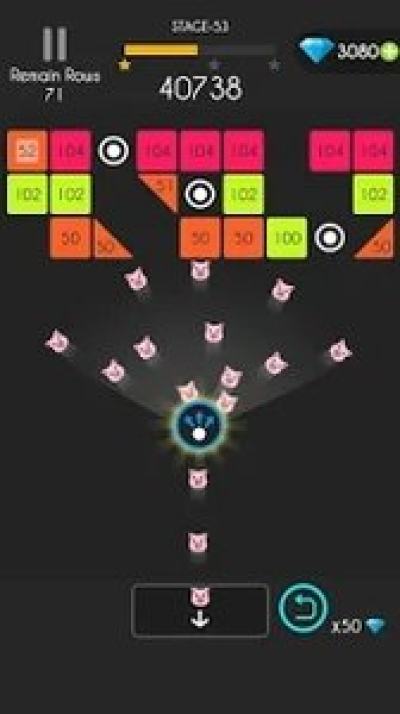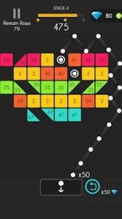 按住屏幕瞄准,将小球弹射到砖块上,突破所有的砖块!玩家需要有战略性的思考,看看怎样才能一次性弹射更多的砖块!