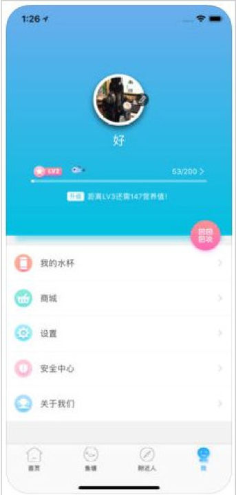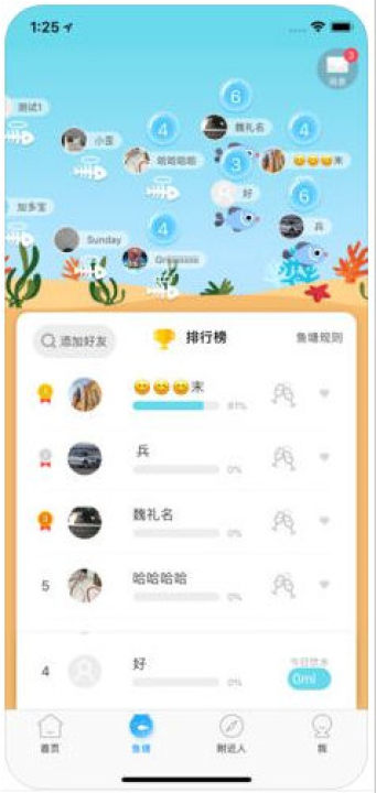 2、在“鱼塘”板块,您和您的好友可以进行饮水PK,进行有趣的小鱼养成计划游戏,让饮水变的乐趣横生;