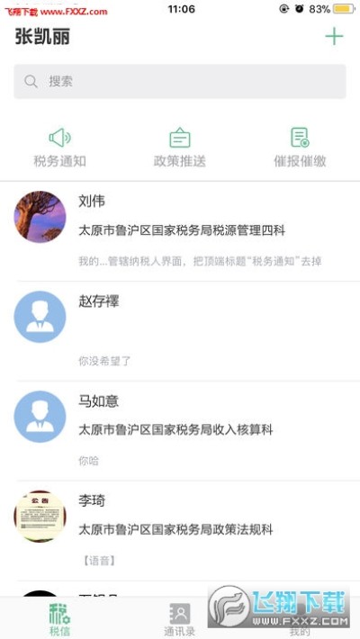 纳税人登录后,可以查看税务机关公开的机构职能信息,包括税务系统所有组织机构以及每个机构下的人员信息。税务人员登录后,可以实时查看权限内服务纳税人的信息,随时随地进行一对一、一对多辅导或根据行业特点、企业类型等特点筛选组群批量进行快捷发送通知和催报催缴。