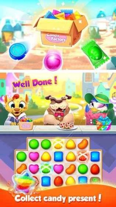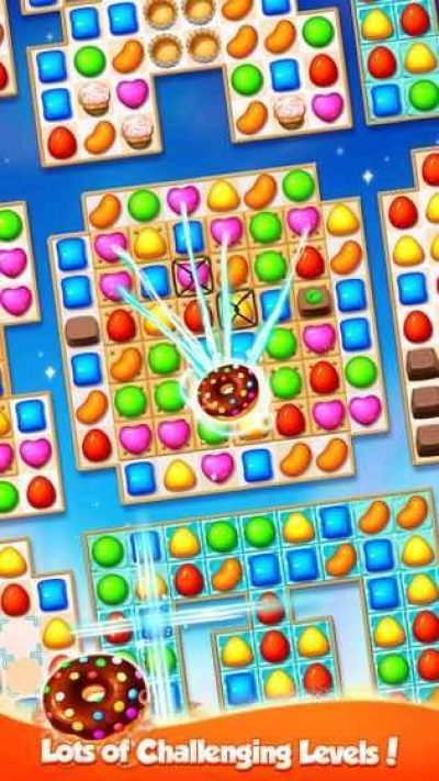 在糖果欢乐日开启和挑战更多独特的关卡。此外,我们已经准备了一些有用和强大的道具,以帮助您克服困难,如果你需要!尝试将更多的糖果巧妙地结合在一起,这将创造出特别的糖果,并获得更高的分数!