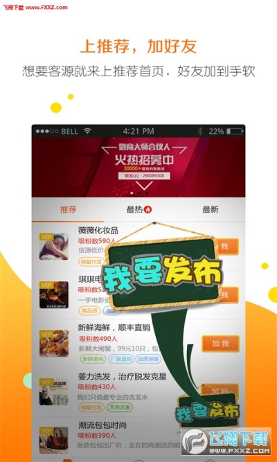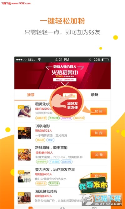 微商大师app是一款非常不错的微商辅助软件,用户可以通过这款软件实现快速涨粉和扩大宣传。更快地获得客户来源,扩大商业圈,帮助微商用户更快地积累资源,快速发展,有需要的用户赶快下载和使用吧!