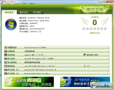 除了显示它们的丰富信息外,还有温度、风扇等重要资料,同时为你自动安装主板、显卡、网卡、声卡的驱动程序国内权威的打分系统,针对CPU进行整数运算,单精度和双精度运算给CPU评分。内存通过复制潜伏期测试来衡量软件的内存分数。让你完全了解自己的电脑性能。