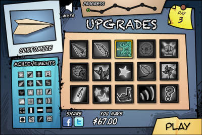 《心愿纸飞机》是一款休闲益智的小游戏,游戏的玩法类似于《愤怒的老奶奶向前冲》或者是《死宅必须死》,游戏中你需要投出纸飞机,让它在空中保持尽可能长的时间,飞出尽可能远的距离。在空中飞行的时候能够获得资金购买各种升级,让飞机飞得更远。