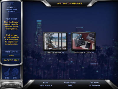 《秘密侦探4:迷失洛杉矶》是一款寻物类的解谜游戏,游戏中你将在好莱坞的各个著名景点寻找案件的线索,用你敏锐的眼光发现重要的物品,偶尔用用提示能够节省大量的时间。不同关卡还会有很多不同类型的小游戏需要你来解决。