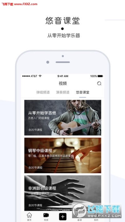 悠音一个音乐社区APP。音乐教育平台&&音乐社区。让音乐爱好者能够在悠音上学习乐器并且弹唱、演奏视频的分享进行互动。产品功能介绍:免费乐器教学、音乐短视频分享、吉他调音器、海量曲谱。