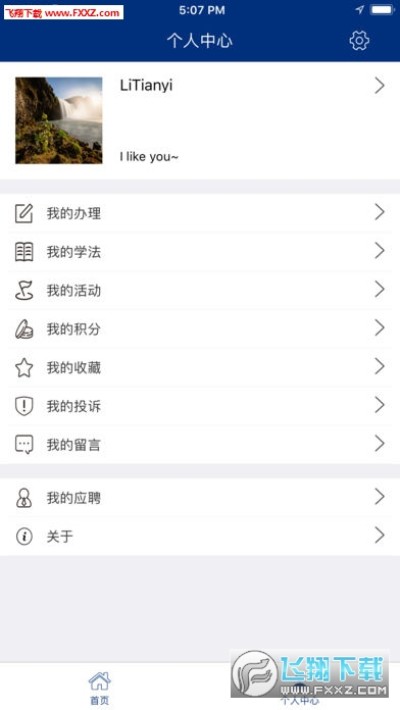 个人中心,首先会判断是否登录,如果没有登录,那么将会跳入登录界面,如果登录了,那么会展示各种信息:头像,姓名,个性签名,我的办理,我的学法,我的活动,我的积分,我的收藏,我的投诉,我的留言,还有我的应聘,关于。如果是志愿者,那么会有我的志愿者信息,如果有我的志愿点,那么会有志愿点信息。点击导航栏的设置按钮,可以退出登录,修改密码和清除缓存,修改密码的规则是密码必须首位是字母,且是字母和数字,长度在6-18位的组合。退出登录后将离开个人中心,回到首页。