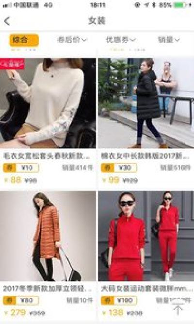 3、【分类】最全的商品分类、 综合排序选择、好评排序选择、价格排序选择、自定义筛选;