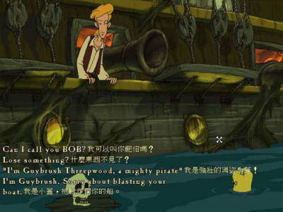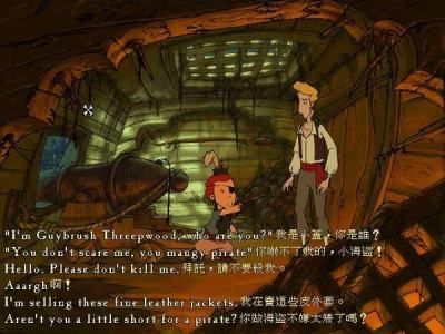 去血之岛的路程很不顺利,一开船地图就被ROTTINGHAM抢走了(理发店的仇,更主要的是财宝),这下叫我怎么救ELAINE?我的船员一个也不帮我,他们的歌虽好听但帮我不了,当然我知道自己该怎么办,那就当一次真正的海盗吧!我在海上同各种海盗进行战斗,抢劫他们的财宝,战斗的方式是看谁嘴上功夫更利害,正所谓君子动口也动手,胜利带给我财富,回到港口,KENNY为上律师学校正在贩卖军火,我不停地升级,直致武装上了超级大炮;失败也可以学习他们的“剑诀”。终于我和ROTTINGHAM面对面决斗了,这家伙真的很难对付,一般海盗的剑诀根本不管用,我练了许久才制服了他(注:许多朋友可能过不去,这里提供几条剑决,作为对付ROTTINGHAM用,当他说