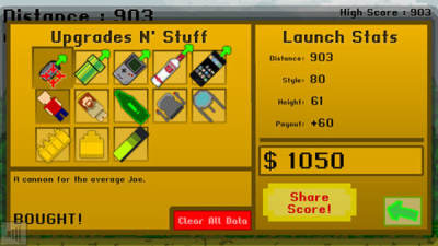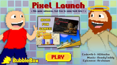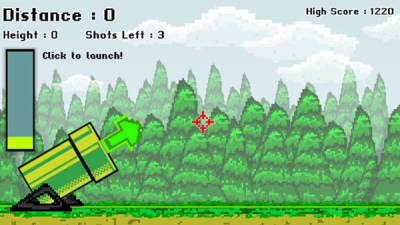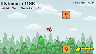 一款像素风格的比距离游戏,只要调整好炮台角度与力度就能将人发射得远远的,在腾空过程,你必须尽可能获取马里奥式的分数盒,你更可以追加射击,使小人飞得更给力,假如遇到阻碍便会很快终止游戏。